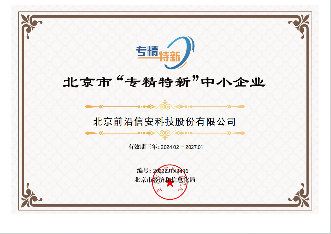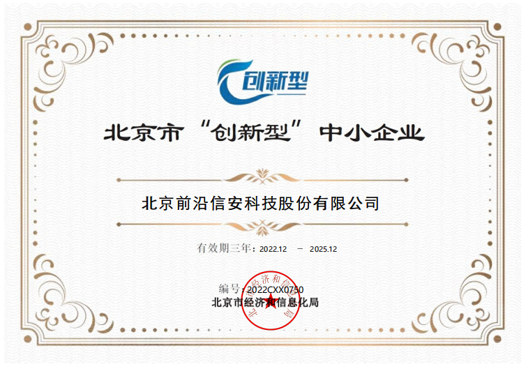 2023年4月,按照工業(yè)和信息化部《優(yōu)質(zhì)中小企業(yè)梯度培育管理暫行辦法》(工信部企業(yè)〔2022〕63號)、《北京市優(yōu)質(zhì)中小企業(yè)梯度管理實(shí)施細(xì)則》要求,前沿信安取得了2023年北京市“創(chuàng)新型”中小企業(yè)認(rèn)定證書。