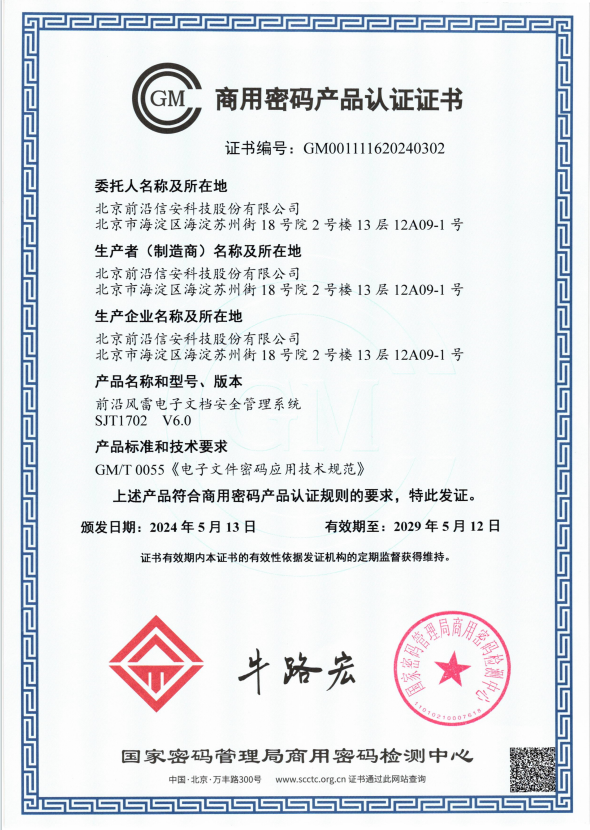 近日,前沿信安自研產(chǎn)品成功取得《商用密碼產(chǎn)品認(rèn)證證書》,產(chǎn)品符合GM/T0065-2019《商用密碼產(chǎn)品生產(chǎn)和保障能力建設(shè)規(guī)范》、GM/T0066-2019《商用密碼產(chǎn)品生產(chǎn)和保障能力建設(shè)實(shí)施指南》,順利通過國家密碼管理局安全性審查,取得由國家密碼管理局商用密碼檢測中心頒發(fā)的《商用密碼產(chǎn)品認(rèn)證證書》,再次彰顯了我公司在信息安全領(lǐng)域的創(chuàng)新實(shí)力和技術(shù)水平。